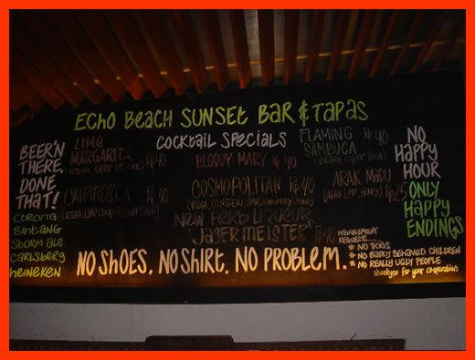 Echo Beach House, à Echo Beach Canggu propose un parking à proximité de son établissement. Echo Beach House, accepte les cartes bancaires en moyen de paiement. Echo Beach House dispose d'un bar pour déguster cocktails et autres boissons Echo Beach House met à disposition de ses clients des toilettes privées. Echo Beach House propose un service d'accès à internet sur la commune de Echo beach Canggu, utilisable gratuitement lors de la consommation en terrasse ou à l'intérieur. Echo Beach House à Echo Beach Canggu met à votre disposition ses infrastructures pour l'organisation de vos évènements professionnels ou privés. Pour que votre venue soit exceptionnelle votre établissement Echo Beach House propose des animations diverses et variées. Pour votre sécurité, la plage de Echo Beach House, à Echo Beach Canggu est surveillée par des maitres nageurs. Echo Beach House, dispose de douches privées. Des activités nautiques diverses sont proposées proches de Echo Beach House à Echo beach Canggu .
